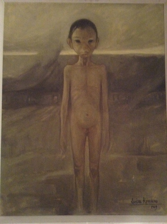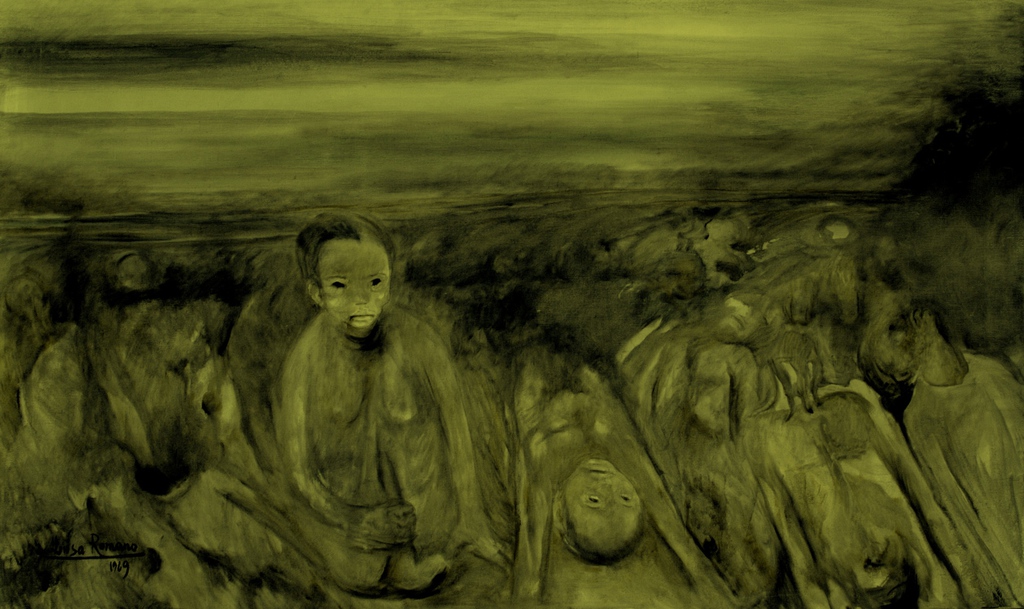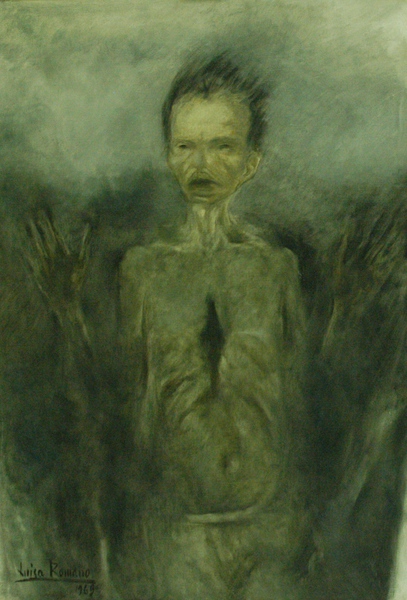Il dramma del Vietnam è vissuto da Luisa Romano con un profondo senso di solidarietà, più Leopardiano che cristiano. Non mancano i simboli, del resto involontari, della Crocefissione: in un quadro dei pali in croce, in un altro un filo spinato teso che non è se non una corona di spine srotolata. Vietnam, popolo crocefisso. Ma è Leopardiana la solitudine senza speranza in cui sono immerse quelle figure schiacciate sotto il peso dei grigi. La cieca inginocchiata non prega, il suo sguardo vuoto è una accusa. Leopardiano è l’appello alla fraternità umana davanti al dolore universale. Il Leopardi della “Ginestra”, non quello degli “idilli”.